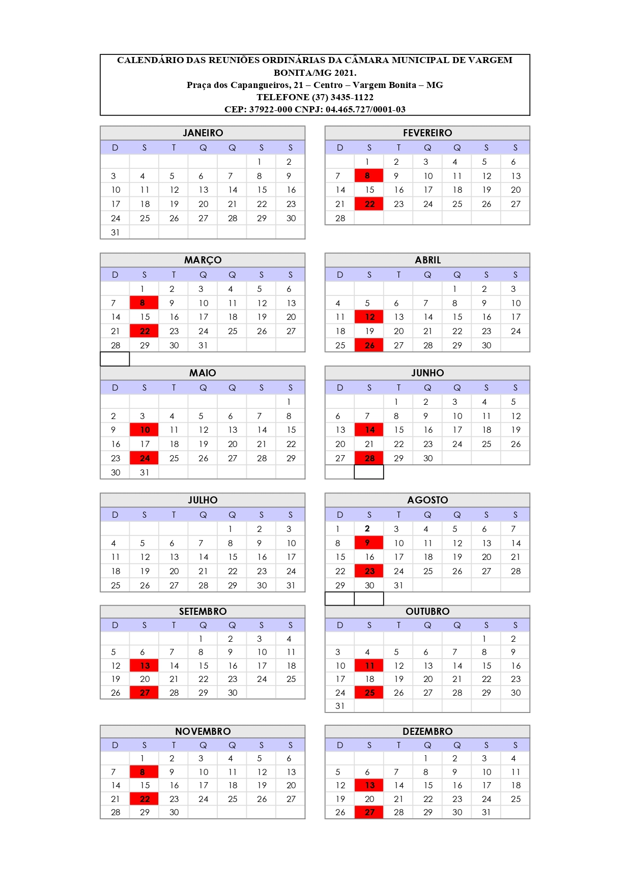 Calendário Reuniões 2021